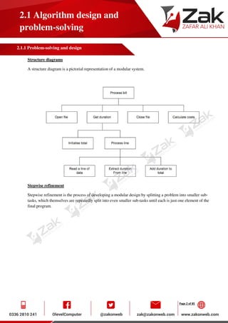 This document discusses algorithm design and problem solving. It covers topics like top-down modular design, structure diagrams, stepwise refinement, pseudocode, flowcharts, and validation checks. An example flowchart is provided that squares the first 5 numbers. Pseudocode is also demonstrated for an ATM algorithm. Key aspects of algorithm evaluation like efficiency, correctness, and appropriateness are defined. Various programming constructs like assignment statements, arithmetic and relational operators, and Boolean logic are also explained.