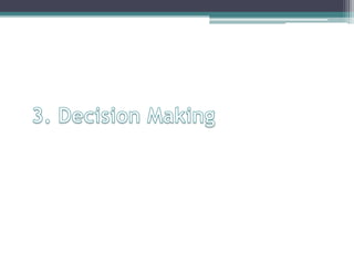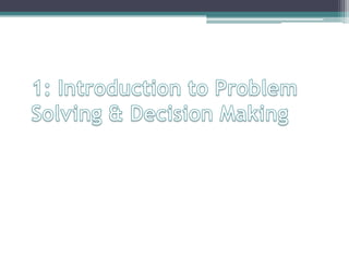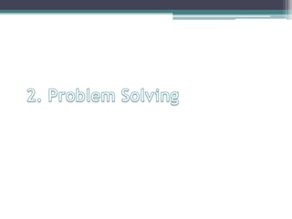 This document discusses problem solving and decision making at the workplace. It outlines a problem solving model involving 6 steps: 1) recognizing and defining the problem, 2) gathering information, 3) analyzing the information, 4) developing and selecting solutions, 5) implementing the solution, and 6) evaluating the solution. It also describes a fishbone analysis tool used to identify root causes of problems by categorizing potential causes. Key aspects of effective problem solving include using a systematic approach, involving others, and evaluating solutions. The document also discusses making routine, adaptive, and innovative decisions and ingredients for good decision making such as following a process, involving teams, being creative and objective.
