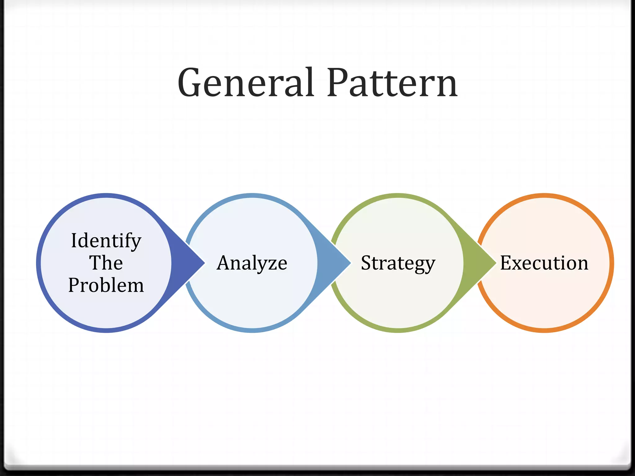 1) Identify the problem, 2) Analyze the problem logically and define sub-goals, 3) Select the best strategy by considering alternatives and developing a plan, 4) Execute the strategy through a clear timeline and work prioritization while focusing on the end-to-end solution and involving key players. Common mistakes at each step like lack of data analysis or follow up are also discussed.