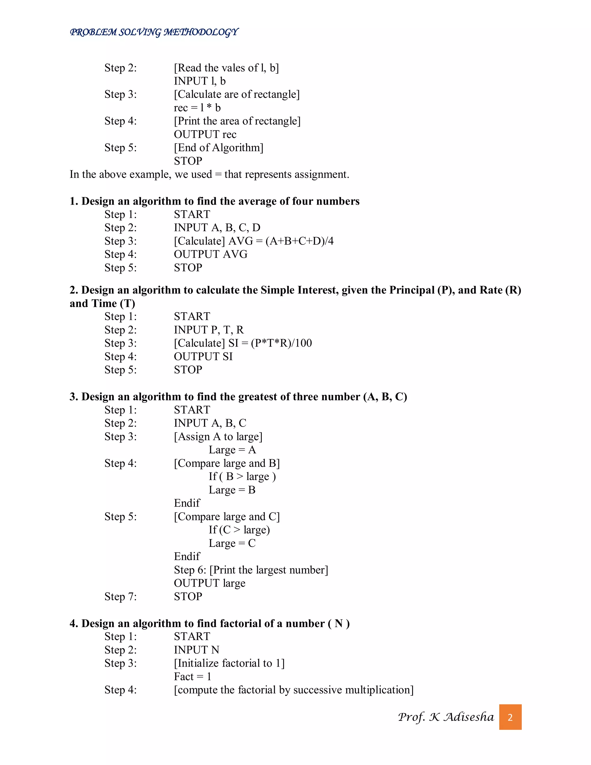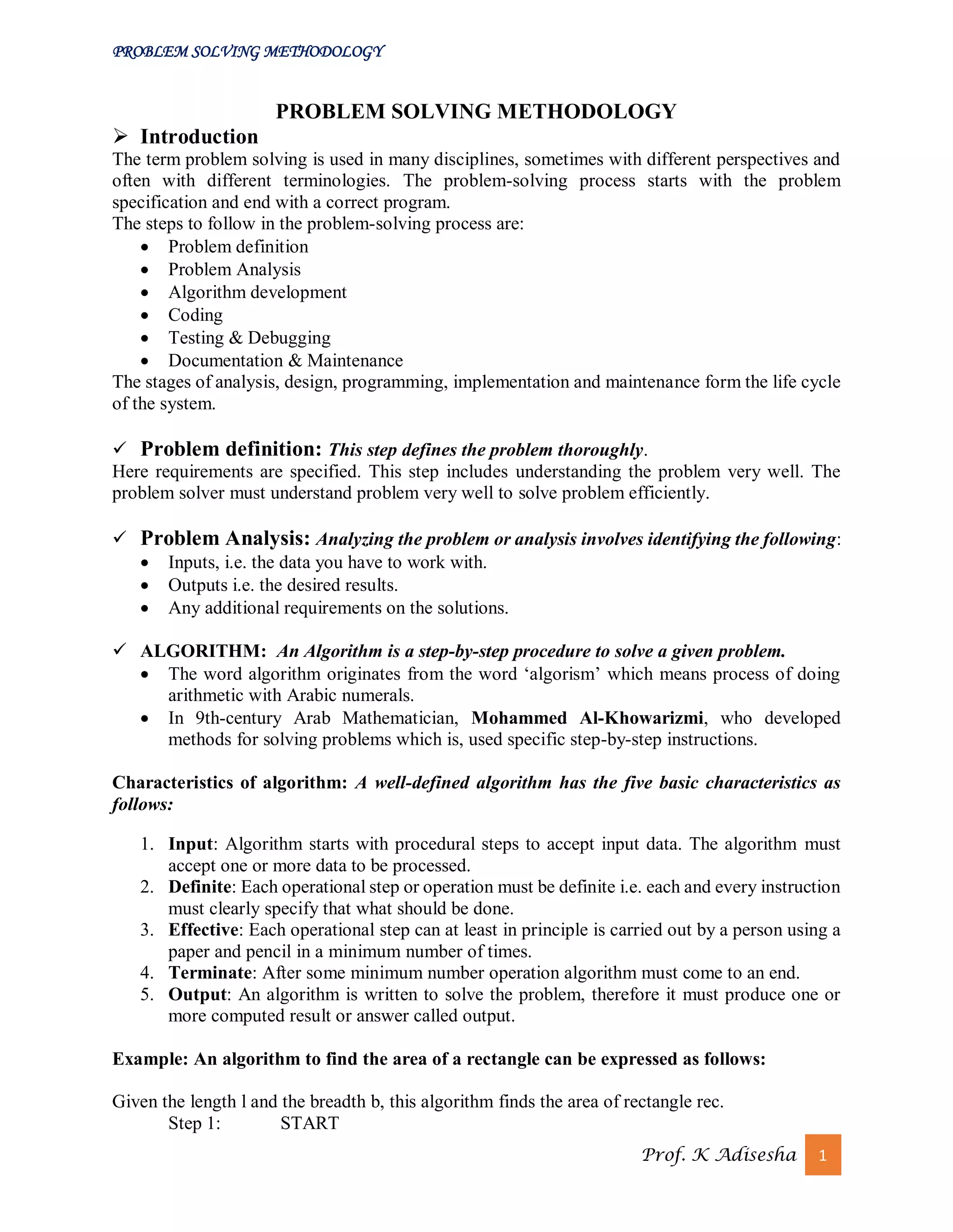 The document outlines a comprehensive problem-solving methodology that includes steps such as problem definition, analysis, algorithm development, coding, testing, debugging, and maintenance. It emphasizes the importance of algorithms and flowcharts in programming, detailing their advantages and disadvantages, as well as providing examples of various algorithms and constructs like loops and conditional statements. Additionally, it discusses the characteristics of good programming practices and approaches such as top-down and bottom-up design.