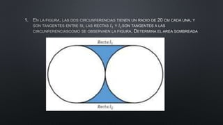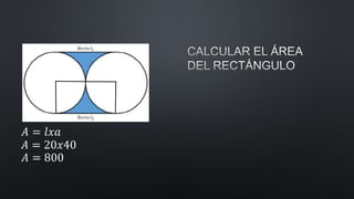 The document discusses calculating the area of a shaded region within overlapping circles and squares. It first finds the area of one circle as πr^2, then doubles this value to obtain the area of the shaded region within both circles. It also finds the diagonal of a square to calculate the radius of one circle, and uses that radius in πr^2 to calculate the area of that circle.