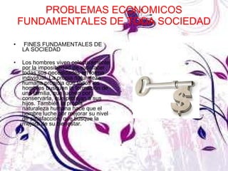 Este documento describe los principales problemas económicos que enfrenta toda sociedad y el proceso para resolverlos. Explica que el objetivo fundamental es satisfacer las necesidades de los individuos y la sociedad de manera óptima a través de la producción de bienes y servicios, su intercambio en el mercado, distribución a través de salarios, rentas e intereses, y consumo directo o productivo por parte de los agentes económicos como las familias y empresas.