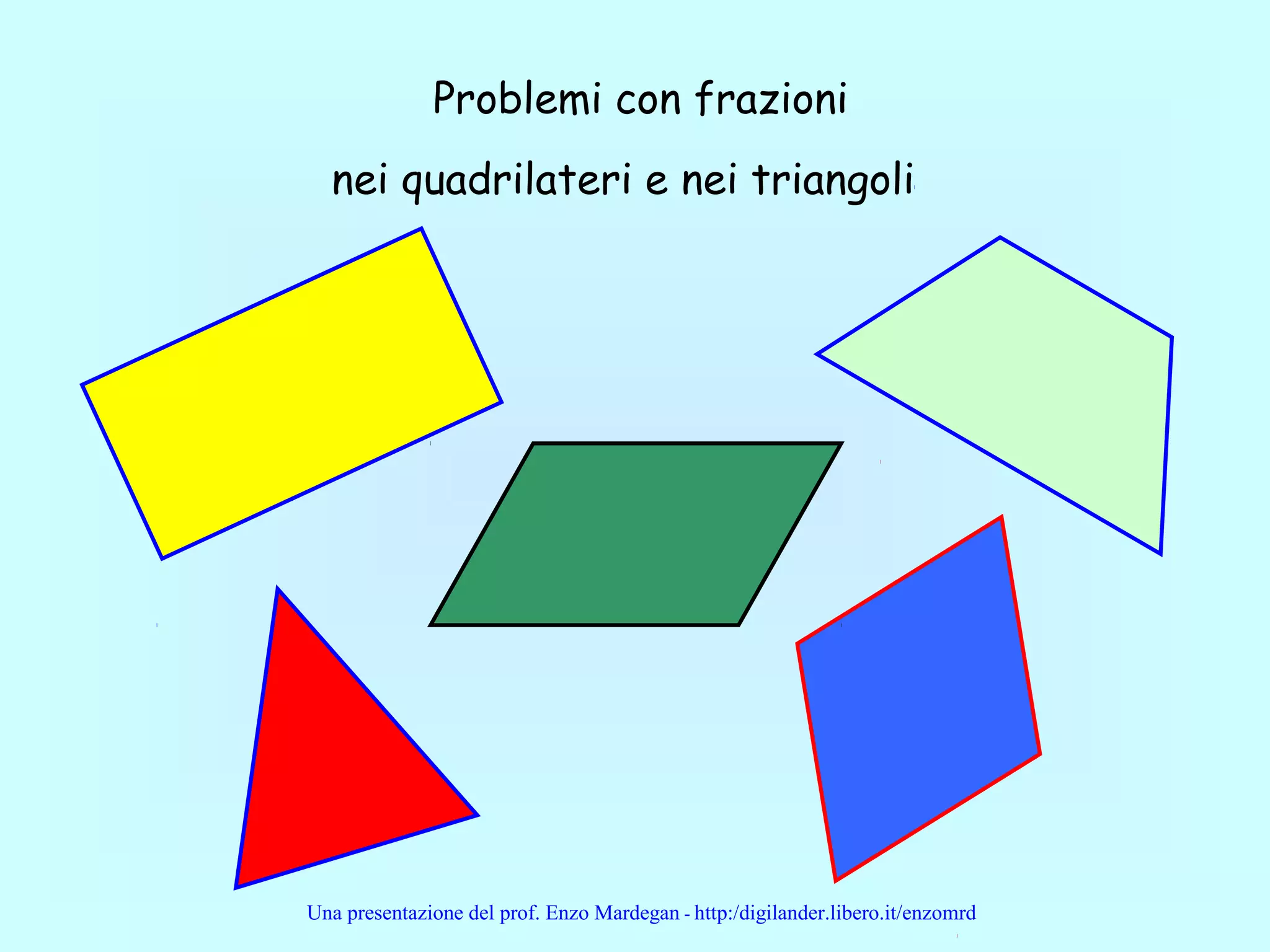 Il documento presenta vari problemi matematici riguardanti le frazioni applicate a quadrilateri e triangoli, illustrando come calcolare dimensioni, aree e relazioni tra altezza, base e lati. Vengono forniti esempi concreti di calcolo utilizzando frazioni per risolvere le problematiche geometriche descritte. Inoltre, il prof. Enzo Mardegan esplora diverse configurazioni geometriche e le corrispondenze fra le loro dimensioni.