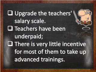 1) Declining quality of education as seen in poor test scores and a high percentage of students and teachers failing certification exams.