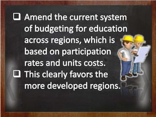 3) Underfunding of education relative to other ASEAN countries and low spending per student that has declined in real terms.