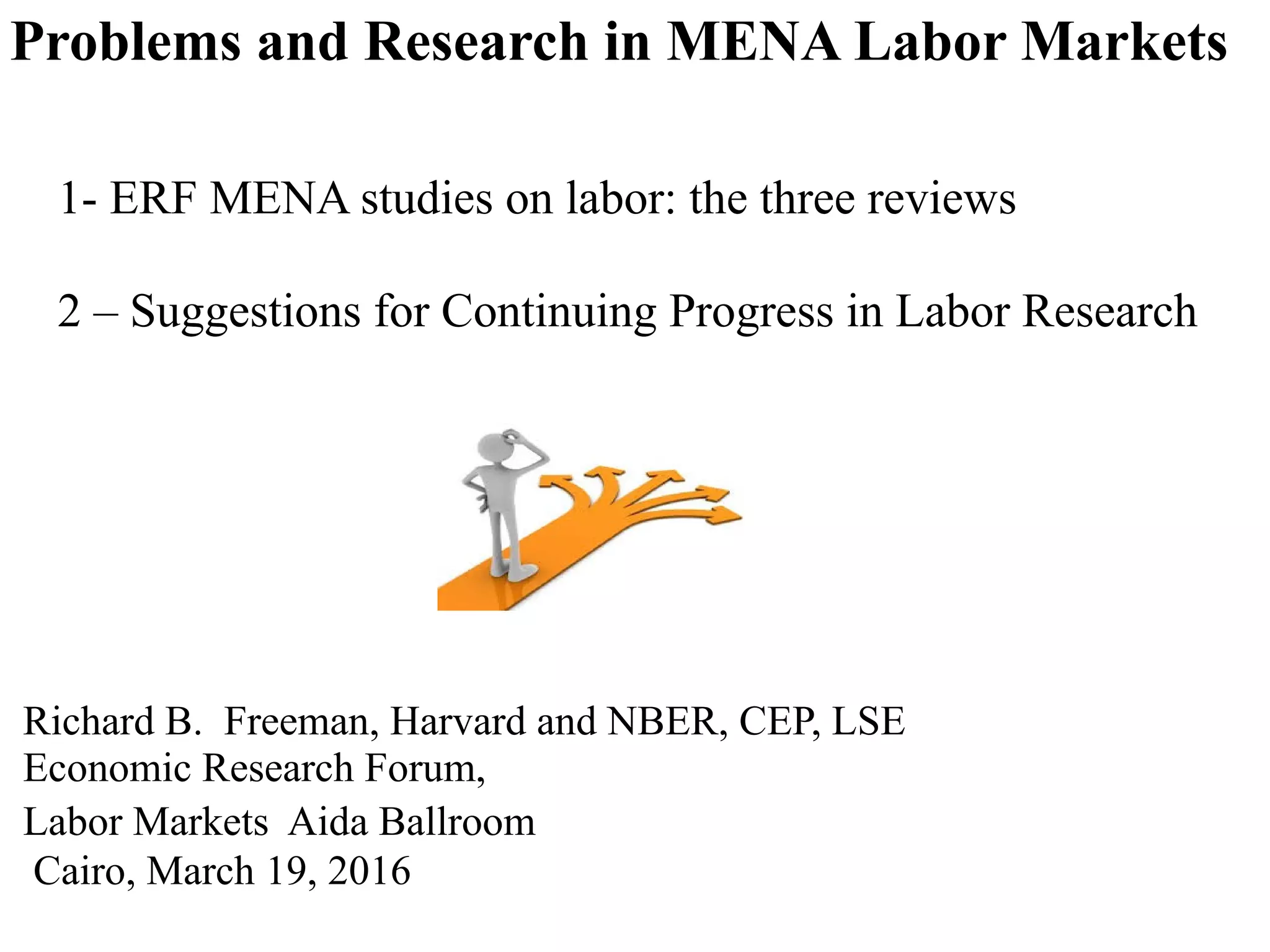 This document discusses problems in labor markets in the Middle East and North Africa region and suggestions for continuing labor research. It covers four main topics: 1) issues with informal sectors and labor regulations based on ERF studies; 2) the importance of rural-urban migration; 3) challenges with education systems not matching job demands; and 4) progress made with developing panel data but needing to link worker and firm data. It concludes with suggestions to improve existing data and analyses, expand data collection to new sources like social media and administrative records, and conduct small experiments to test policy ideas.