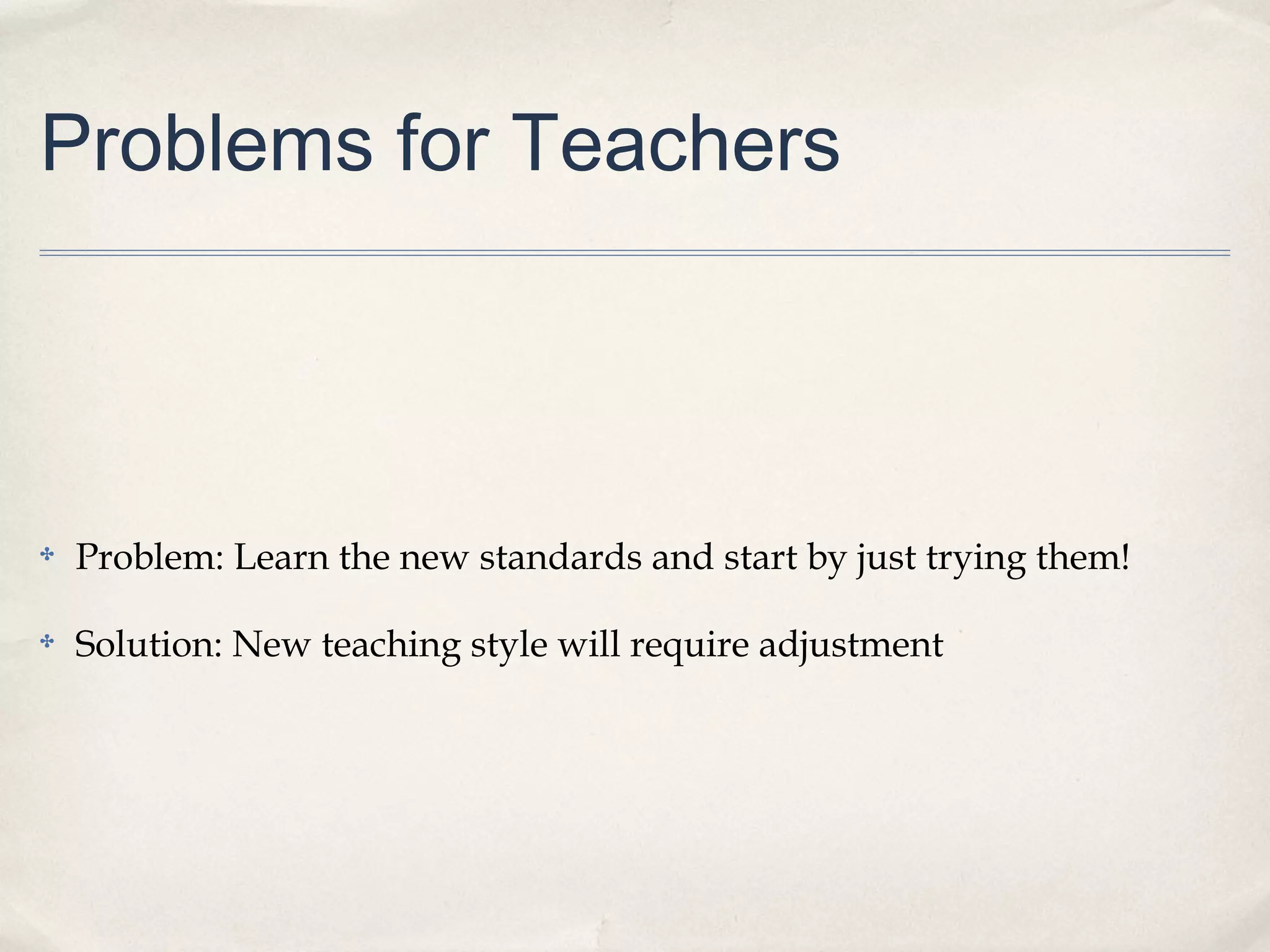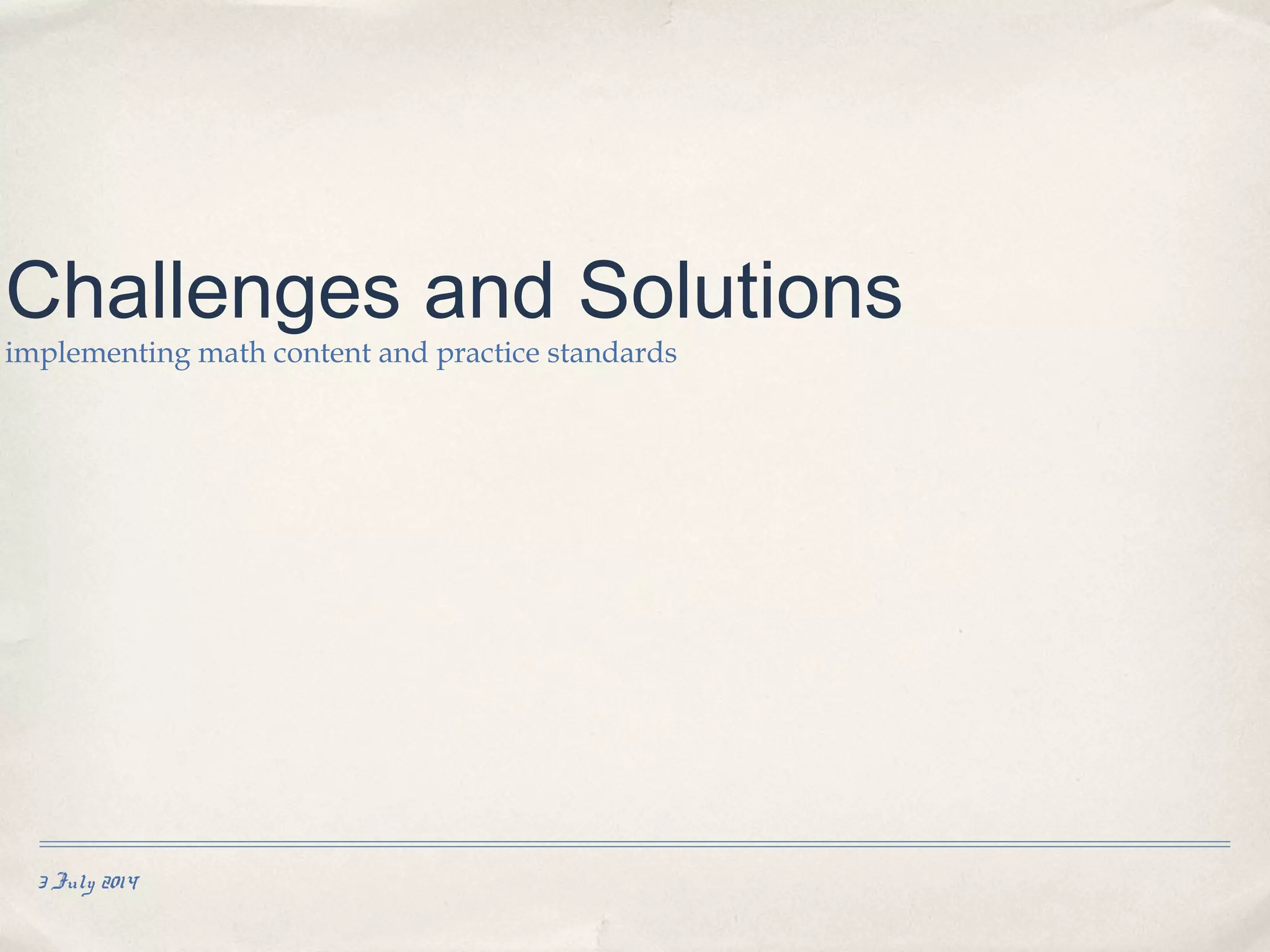 The document outlines challenges and solutions for teachers, administrators, parents, and students regarding the implementation of new math content and practice standards. For teachers, the challenge is learning the new standards while starting with just trying them, and the solution is adjusting to a new teaching style. For administrators, the challenge is ensuring teacher accountability, and the solution is providing professional development training. For parents, the challenge is helping students study differently, and the solution is paying attention to work coming home. For students, the challenge is relying on partner work rather than direct teacher instruction, and the solution is staying engaged with the teacher and peers.