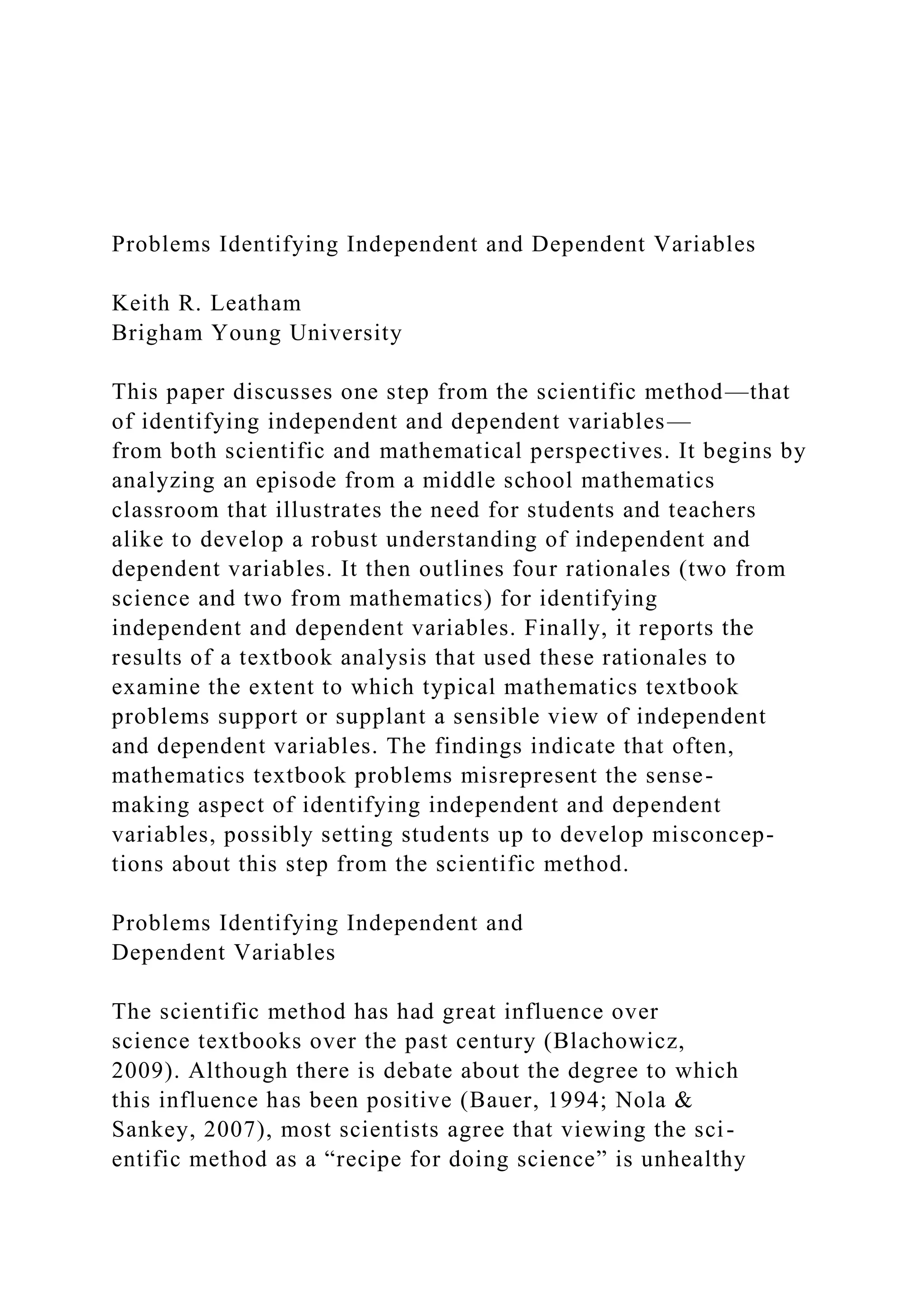 This document discusses identifying independent and dependent variables from scientific and mathematical perspectives. It begins with an example from a middle school classroom where students struggled to identify the independent and dependent variables in equations. It then outlines four rationales for identifying these variables: two from science related to control and causation, and two from mathematics related to conventions and functions. Finally, it reports on an analysis of mathematics textbooks that examined how well problems supported understanding independent and dependent variables.