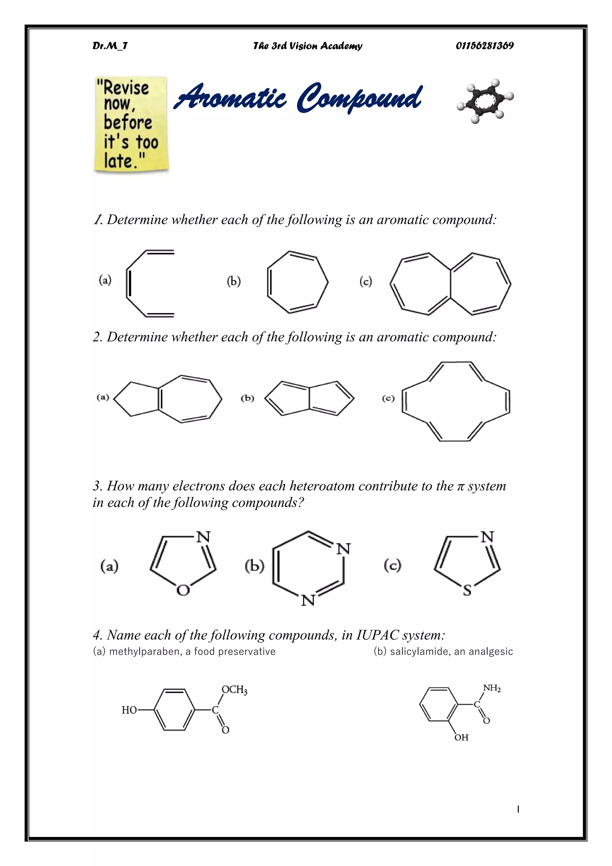 This document contains a series of questions about aromatic compounds and their reactions. It asks the reader to identify aromatic compounds, predict products of substitution and other reactions involving aromatic rings, draw reaction mechanisms, and propose syntheses of compounds through multiple step reactions starting from various reagents. It covers topics such as electrophilic aromatic substitution, nitration, sulfonation, Friedel-Crafts reactions, and the use of diazonium salts and other intermediates in multi-step syntheses.