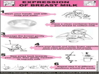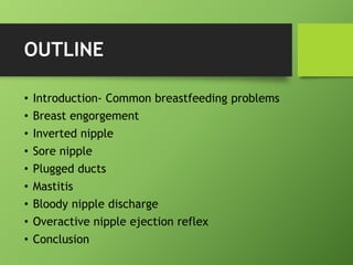 Breastfeeding problems are common among new mothers and can challenge both mothers and infants. Common problems include breast engorgement, sore or painful nipples, plugged ducts, mastitis, and an overactive milk ejection reflex. Effective management involves frequent breastfeeding or milk expression to drain breasts fully and prevent blockages, applying warm compresses or cold packs to relieve pain and swelling, and seeing a doctor if issues like infection or bloody discharge persist. With early detection and treatment, most breastfeeding problems can be easily managed.