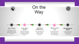 The document discusses problems with the Indian education system and potential solutions. Some major issues identified are over reliance on rote learning instead of conceptual learning, focus on theoretical knowledge without practical application, treating different subjects differently instead of equally, lack of guidance for students, unwillingness to change outdated practices, and blindly following societal norms. This results in poor employability rates and fewer research publications. Potential remedies proposed include counseling, changing exam patterns, getting regular feedback, incorporating new technologies, focusing on essential skills, and learning from education systems in other countries like Japan that place more emphasis on applications and abstract thinking.