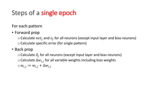 This document describes the steps of backpropagation in a multi-layer perceptron neural network. It details the forward and backward passes for each training pattern in an epoch, including calculating the output, error, deltas, and updating the weights. An example is provided to demonstrate the process for one full epoch on a sample dataset with 4 patterns to classify.