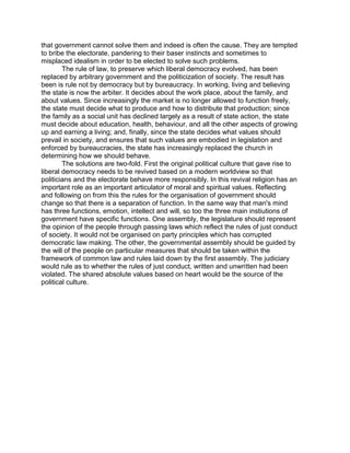 Modern democracy is facing problems as it has evolved to empower special interest groups over the true will of the majority. Politicians pander to narrow interests to gain support, enacting policies most people would disapprove of. Additionally, governments have become unlimited as legislatures make and enforce laws, rather than separating these functions. This has replaced rule of law with arbitrary rule and increased the role of bureaucracy in controlling society. The solutions proposed are reviving responsible political culture and separating the legislative, governmental, and judicial functions of the state.