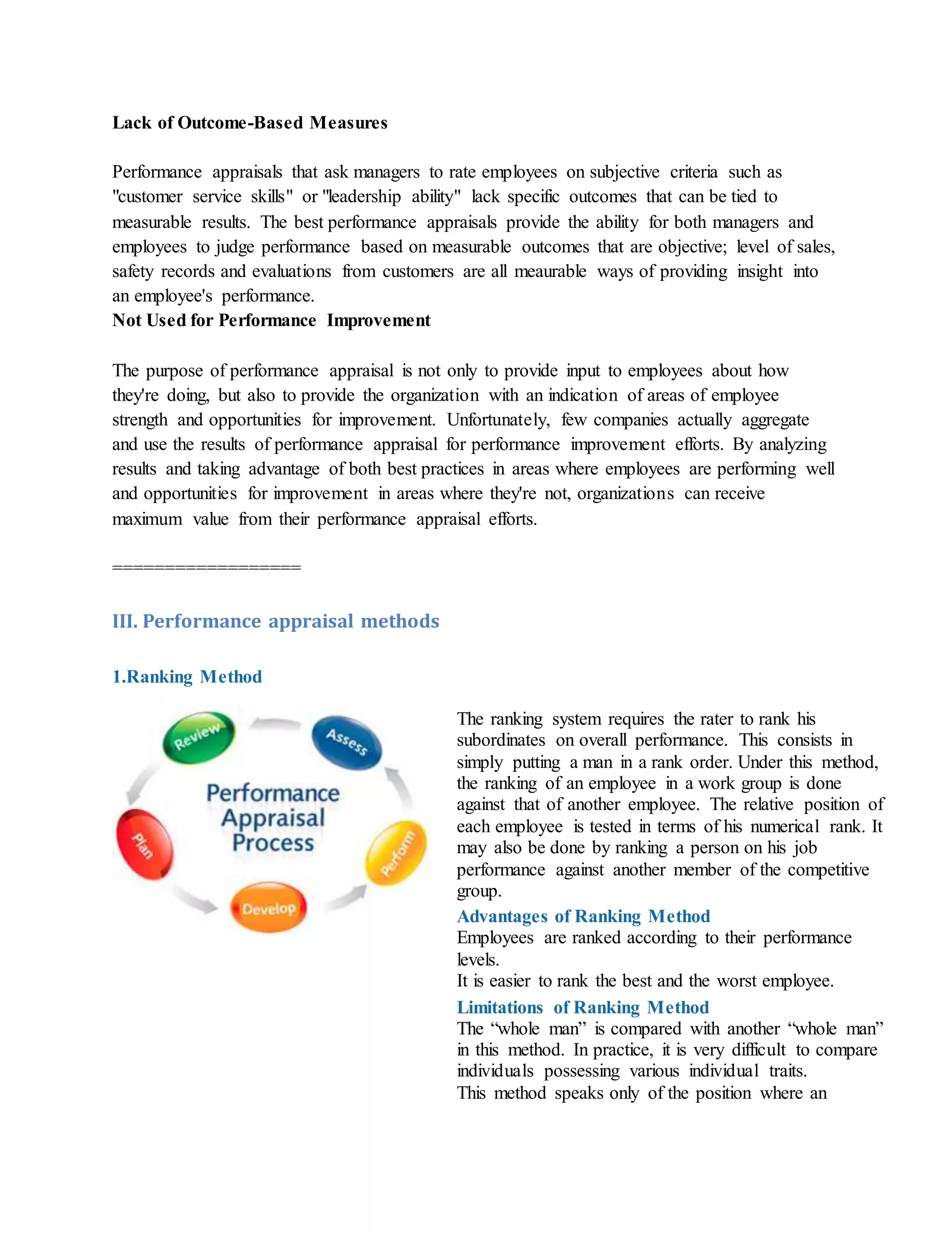 The document discusses the various problems associated with performance appraisal in organizations, including inconsistencies in manager training, subjective evaluation criteria, and the lack of measures for performance improvement. It outlines key performance appraisal methods like ranking, rating scales, checklists, and critical incidents, noting their advantages and disadvantages. Additionally, the document provides links to resources and related topics for further assistance in performance appraisal challenges.