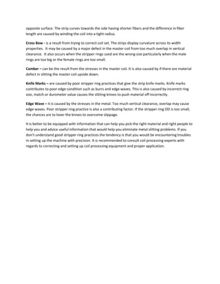 Metal slitting is a shearing process that cuts large rolls of ferrous and non-ferrous metals into narrower rolls as thin as 0.001 inches wide. Common problems that can occur during metal slitting include burrs from too tight or loose horizontal knife clearance, coil set from uneven stretching of metal fibers during winding, and cross-bow caused by defects in the master coil or improper stripper ring size. It is important for new operators to understand the problems that can arise like burrs, coil set, knife marks, and edge waves, which are often due to incorrect blade setup, poor quality metal, or improper stripper ring usage.