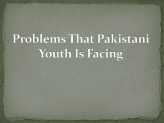The document discusses several issues facing Pakistan: literacy rates, the education system, drugs, unemployment, and the education system. Literacy rates in Pakistan are only 33.8% for females and 47.18% for males, showing many do not receive basic education. Drugs are a major problem for youth, with half addicted, and many dying each year from smoking. Unemployment is also a major issue, currently at 6.5%, with many qualified graduates unable to find work. The education system focuses too much on rote learning and closing critical thinking.