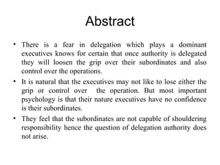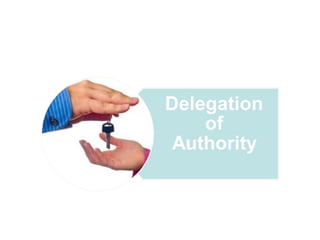 This document discusses problems with delegation of authority in organizations. It notes that executives often fear losing control when delegating authority and lack confidence in subordinates' abilities. There are also psychological barriers like fear of better performance from subordinates. Effective delegation requires increasing job security, creating awareness of its benefits, clearly defining responsibilities, choosing the right people, and linking it to planning. Delegation involves assigning duties and granting authority while also creating accountability.