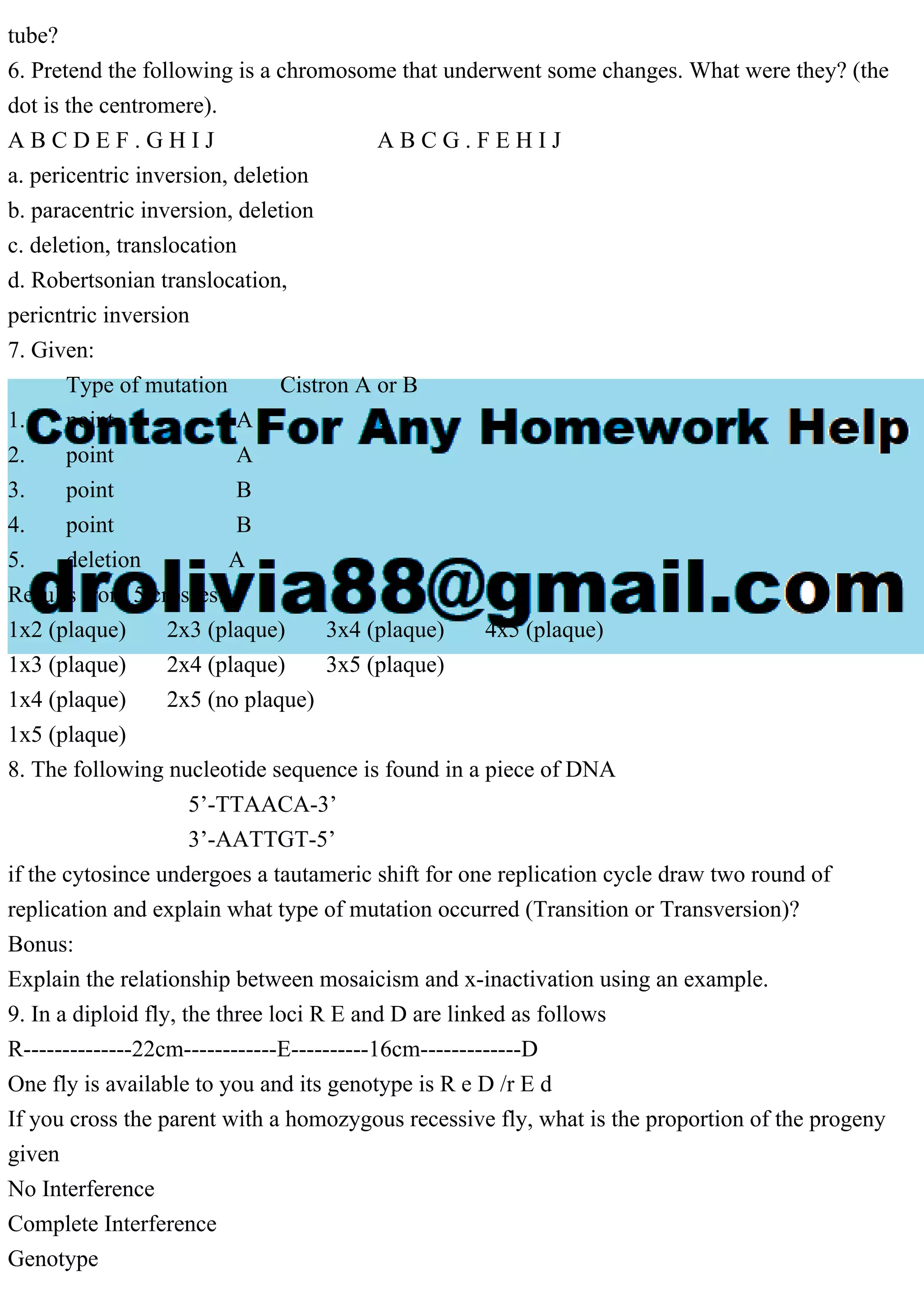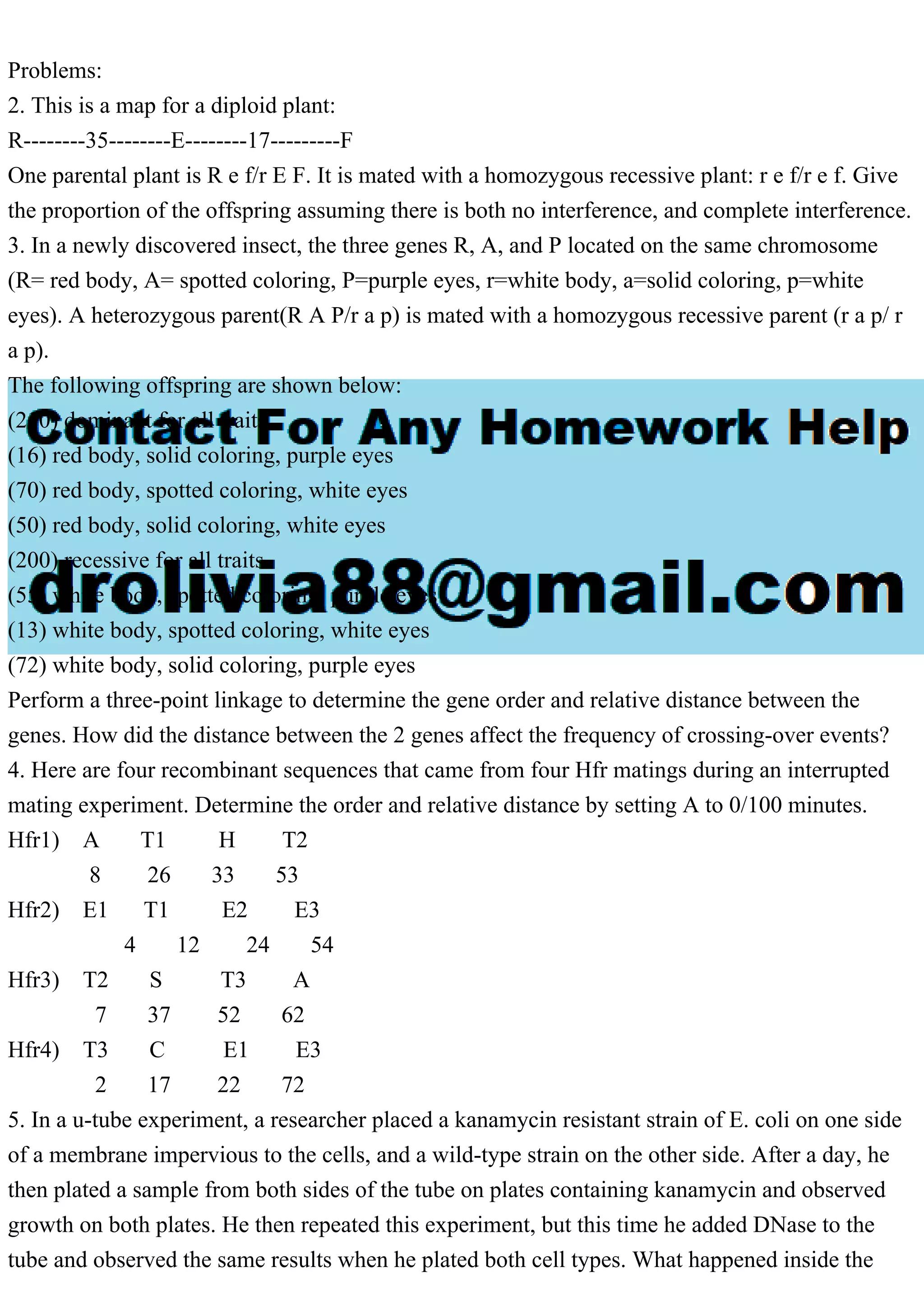The document discusses various genetic experiments involving diploid organisms, including inheritance patterns, gene mapping via linkage analysis, and mutation effects. It describes crossing plants and insects, as well as experiments with E. coli to explore genetic recombination and mutations. Additionally, it covers concepts like interference in genetic crossing, the mechanics of conjugation, and examples of Mendelian traits impacted by nondisjunction.