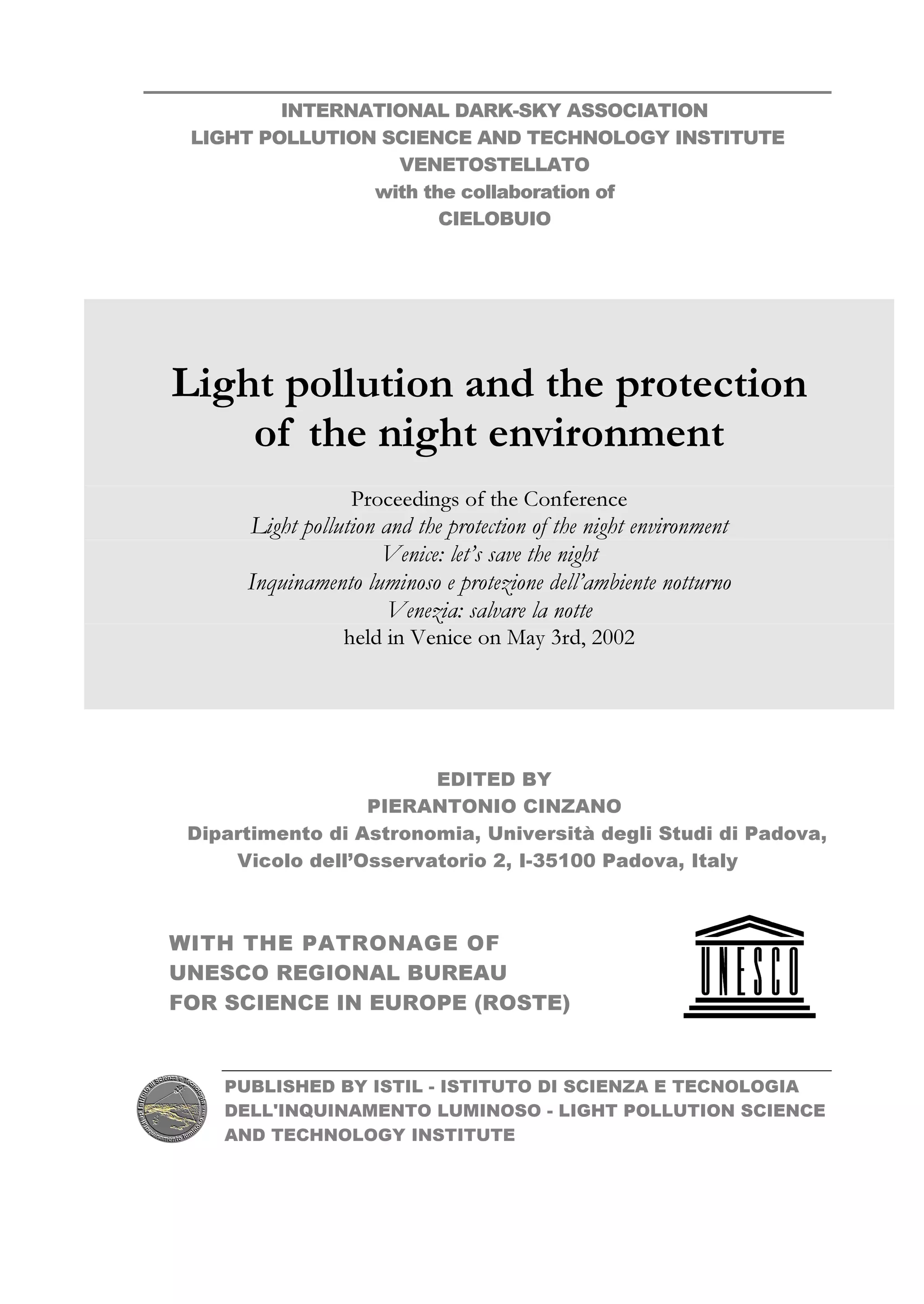 This document appears to be the proceedings from a conference on light pollution and the protection of the night environment that was held in Venice, Italy in May 2002. It includes opening addresses and contributions from various speakers on topics related to light pollution, including its impacts on astronomy, the night sky, and the environment. The proceedings were edited by Pierantonio Cinzano and published by ISTIL - the Light Pollution Science and Technology Institute.