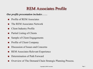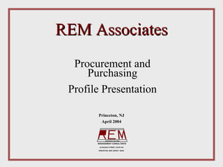 REM Associates is a management consulting firm that provides procurement and purchasing consulting services. It has over four dozen experienced consultants with backgrounds in various business functions and industries. REM Associates works with clients to assess their procurement and purchasing operations, evaluate processes, develop strategies and plans for improvement, and assist with implementing recommendations. The document provides an overview of REM Associates' services and experience working with a range of industrial, consumer product, and other clients on procurement and purchasing engagements.