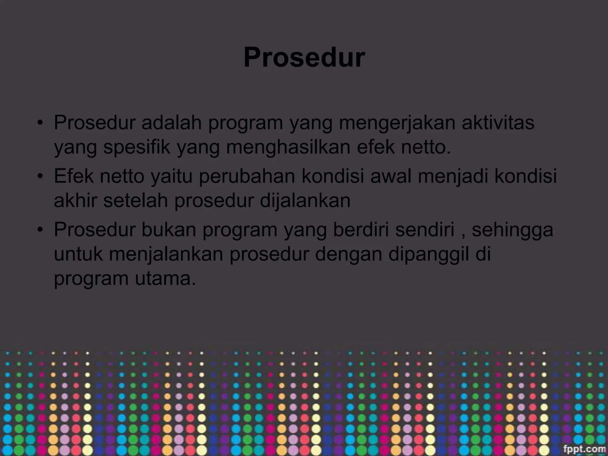 Dokumen ini menjelaskan prosedur dan fungsi dalam pemrograman, terutama dalam Java, termasuk pengertian, cara penulisan, dan perbedaan antara keduanya. Prosedur tidak mengembalikan nilai, sementara fungsi harus memberikan nilai balik, dengan penjelasan tentang penggunaan parameter. Dua jenis parameter yang dibahas adalah parameter aktual dan formal, serta cara kerjanya dalam konteks prosedur dan fungsi.