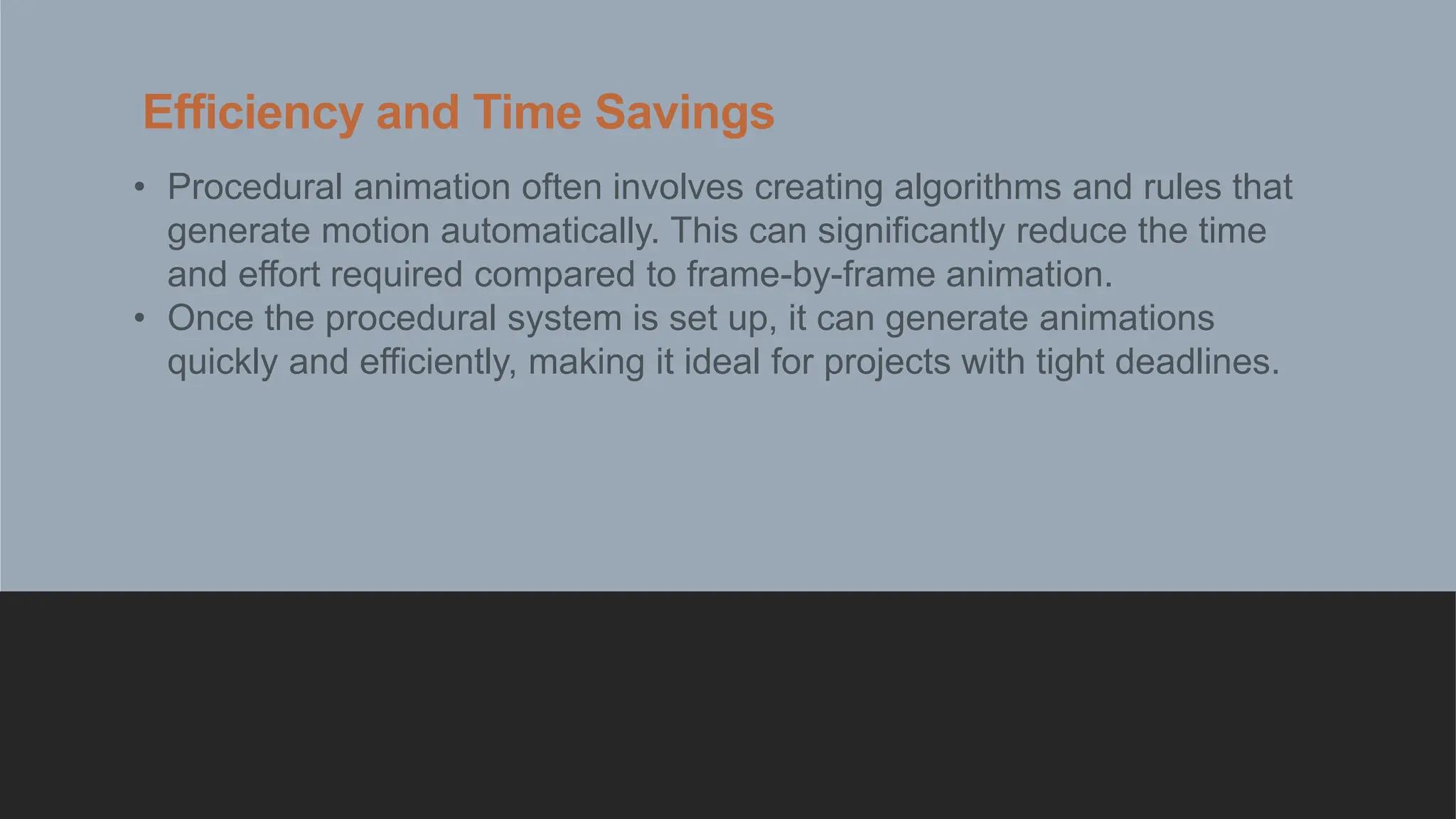 Procedural animation offers significant efficiency and time savings over traditional animation by using algorithms to automatically generate motion, making it ideal for tight deadlines. It provides scalability across various devices, enhances realism through natural variations, and can dynamically adapt to environmental changes. Additionally, procedural methods can reduce file sizes, automate repetitive tasks, and facilitate rapid iteration, although both procedural and traditional animation have unique advantages depending on project requirements.