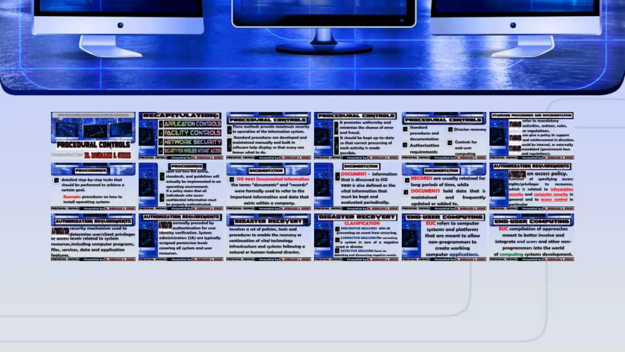 The document discusses methods for ensuring maximum security within information systems through standard procedures and documentation that promote uniformity and reduce errors. It emphasizes the importance of maintaining up-to-date procedures for activities like accessing confidential information and disaster recovery, aligning with ISO 9001's documentation standards. Additionally, it highlights the role of access policies and end-user computing in integrating non-programmers into system development.