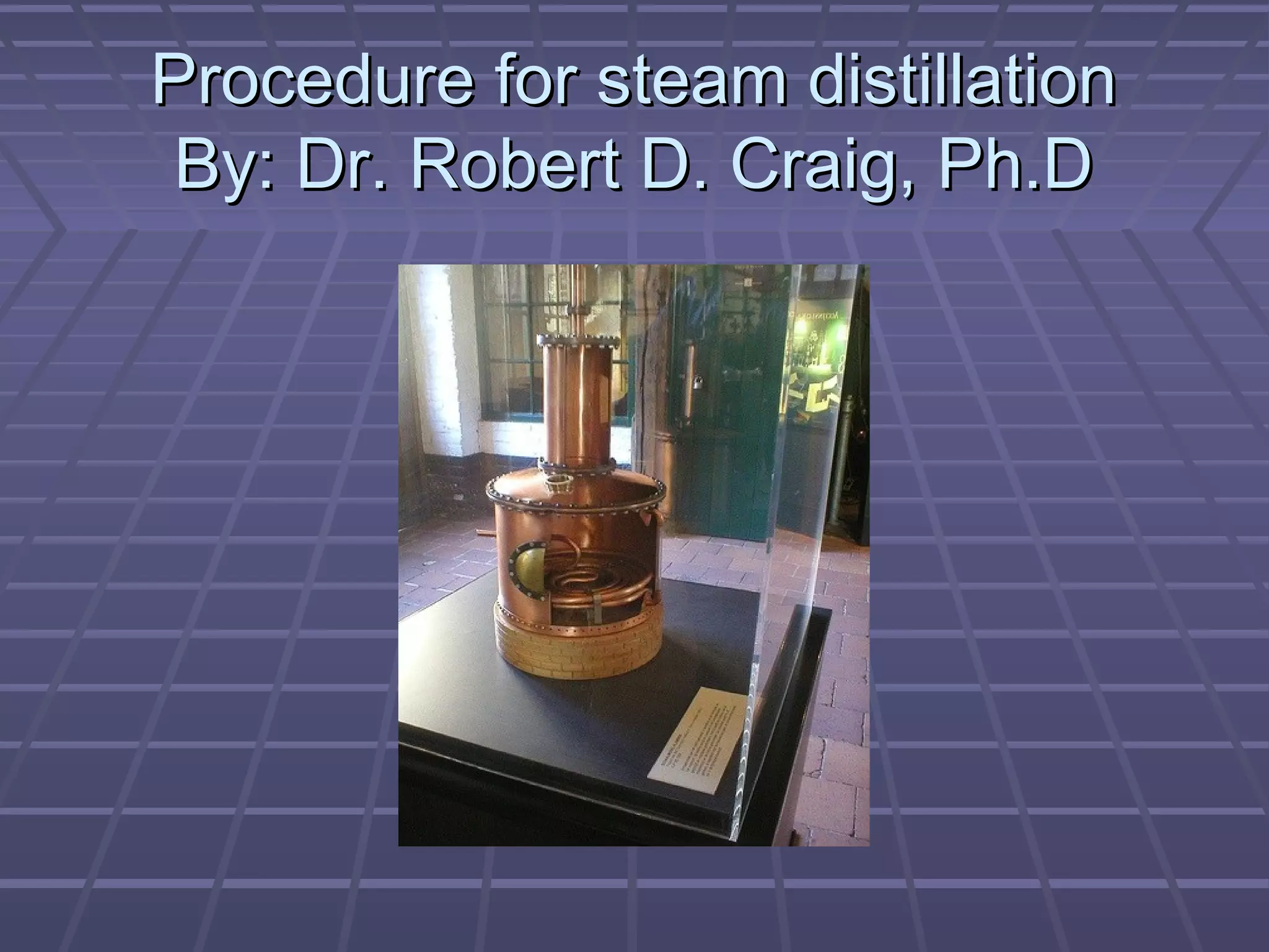 This document provides a procedure for steam distillation. Steam is passed through a round-bottomed flask containing a sample mixture to be separated. A trap allows control of the steam flow and removal of water from the steam line. Condensate containing separated compounds collects in a receiver flask. Once complete, the distillate is extracted with t-butyl methyl ether in a separatory funnel. The ether layer is dried, filtered, and evaporated to obtain the purified compounds, which are weighed and stored. The procedure is described to recover citral from lemongrass oil through steam distillation and extraction.