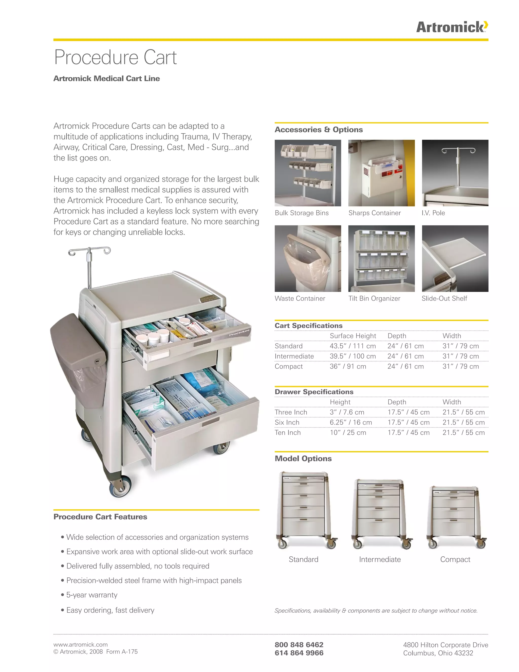 The Artromick Procedure Cart is a medical cart that can be adapted for a variety of applications including trauma, IV therapy, airway, and critical care. It provides organized storage for medical supplies from bulk items to small items. Each cart includes a keyless lock system for security. The cart is available in standard, intermediate, and compact sizes with options for drawers, shelves, bins, and other accessories. It has a wide work surface and is delivered fully assembled.