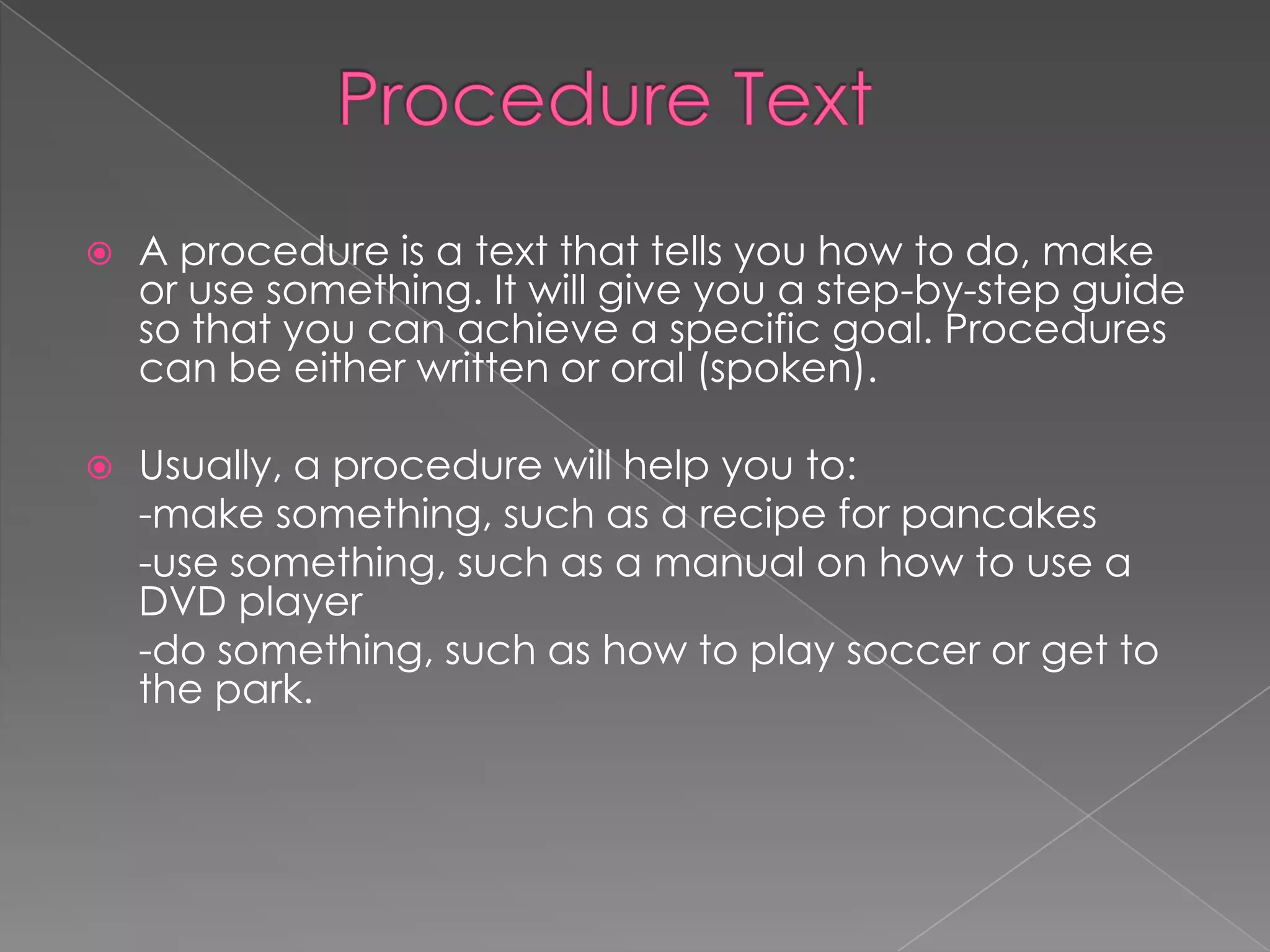 A procedure provides step-by-step instructions to achieve a specific goal, such as making something through a recipe, using an appliance, or playing a game or sport. It explains the purpose and gives directions, typically through a list of numbered steps and sometimes diagrams or images. Procedures can be written down or spoken aloud through things like cooking shows.