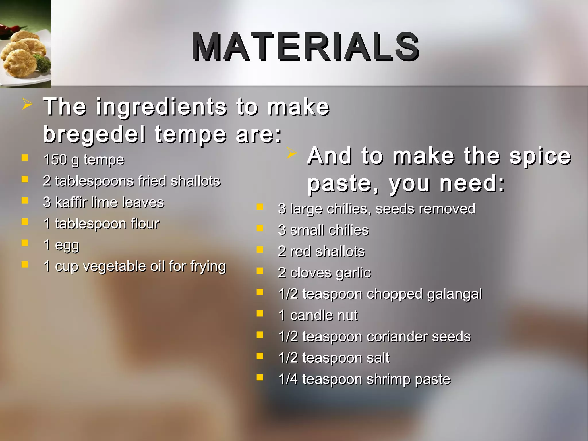 1. Mash 150g of tempe and mix with a spice paste made from chilies, shallots, garlic, galangal, candle nut, coriander seeds, salt, and shrimp paste. Add 2 tbsp fried shallots, 3 kaffir lime leaves, 1 tbsp flour, and 1 egg.