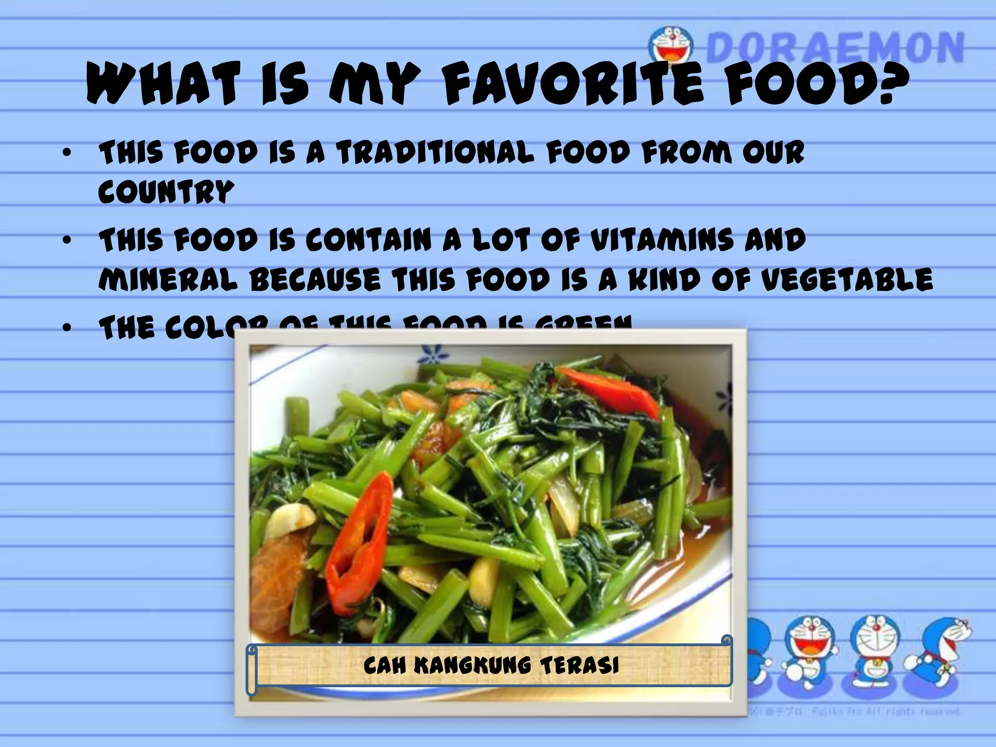 This document provides a recipe for cah kangkung terasi, an Indonesian dish made with water spinach. The ingredients include 1 kg of water spinach, tamarind, oil, and a spice mixture of shallots, garlic, tauco shrimp paste, and red chilies. The procedure is to break the water spinach leaves and stems, stir fry the ground spices until fragrant, add the water spinach and other ingredients, and cook until the leaves are dark green and wilted and the stems are medium green.