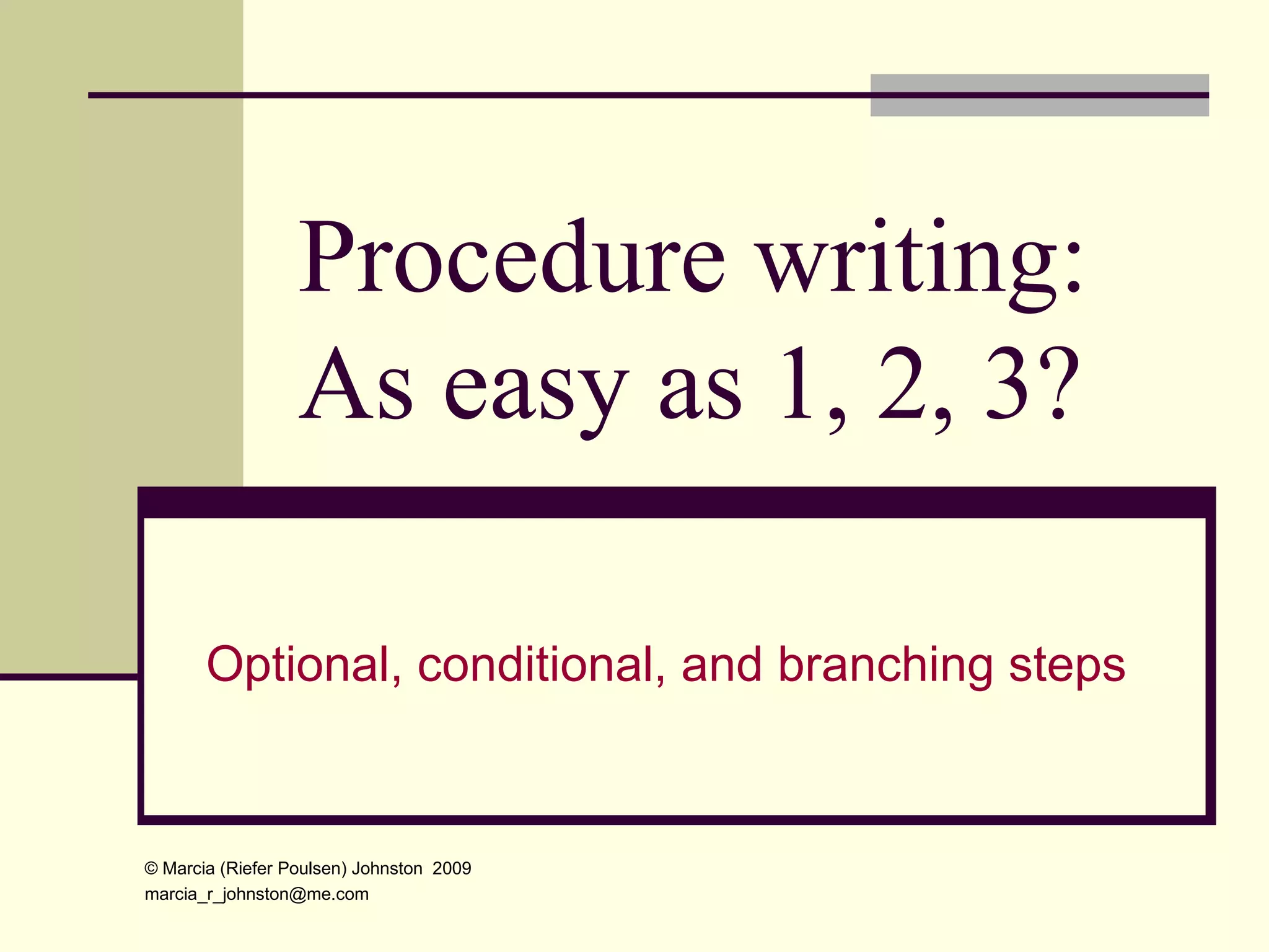 This document discusses different types of steps that can be used in procedural writing, including optional, conditional, and branching steps. It provides definitions and examples to illustrate the differences. The document also includes exercises asking the reader to rewrite procedural steps to clarify their meaning and type. Guidance is given on writing steps in a clear, unambiguous manner.
