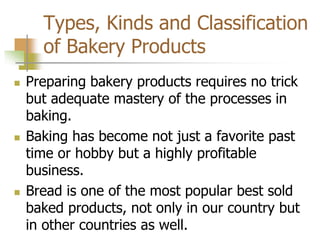 This document provides information on various baked goods and their production methods. It discusses the different types of dough used in baking bread, including lean and rich dough. It also describes the straight and sponge and dough mixing methods. The document outlines the characteristics of well-made bread and discusses various cookie types. It provides details on muffin, biscuit, and muffin mixing techniques.