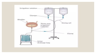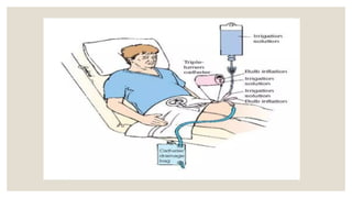 Bladder irrigation is a medical procedure used to clean the urinary bladder and prevent complications associated with catheter use. It can be performed manually or continuously, utilizing sterile techniques and specific equipment to ensure patient safety and efficacy. Potential complications include infection, tissue trauma, urethral irritation, and bladder spasms, which caregivers must monitor closely.