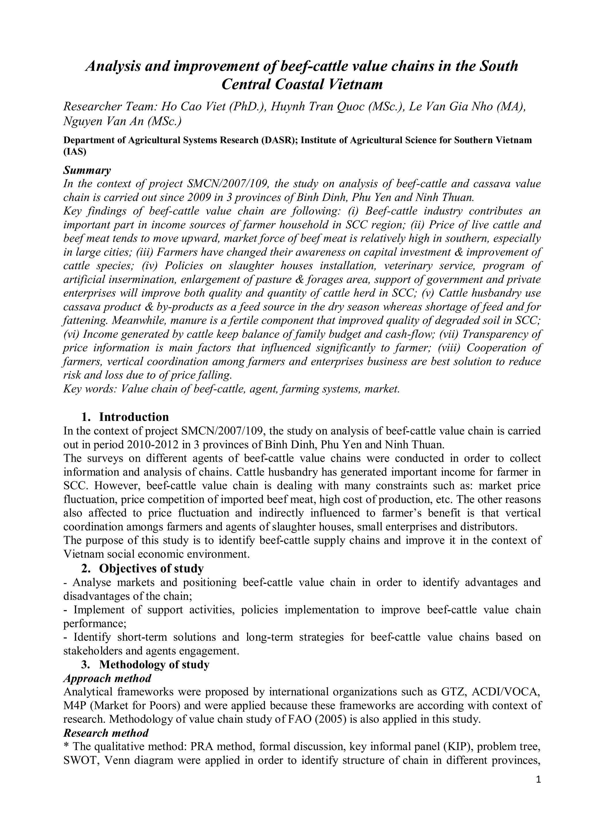 The document analyzes beef cattle value chains in southern central coastal Vietnam. Key findings include: