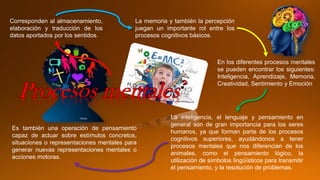 El documento describe varios procesos cognitivos fundamentales como la percepción, la memoria, el aprendizaje, las emociones y la inteligencia. Explica que estos procesos incluyen la adquisición, almacenamiento y uso de información y conocimiento, y que juegan un papel importante en las funciones mentales superiores de los seres humanos como el pensamiento y la resolución de problemas. También discute diferentes teorías sobre la naturaleza de estos procesos cognitivos.