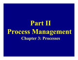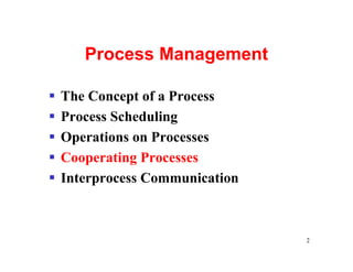 This document discusses process management in operating systems. It defines a process as a program in execution that has a program counter, stack, data section and other runtime elements. Processes can be in one of five states: new, running, waiting, ready or terminated. Each process is represented by a process control block that stores its information. The operating system uses scheduling queues and context switching to allocate CPU time between ready processes. Context switching involves saving the state of one process and loading another. Interprocess communication allows cooperating processes to share resources and data.