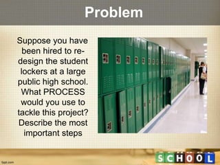 The document outlines a design thinking process for redesigning student lockers at a large public high school. It identifies the key steps as: 1) Identifying current problems with how lockers are allocated by student height and size, and whether materials are user friendly. 2) Determining how lockers can be adapted to be more spacious, modern and useful while optimizing space allocation. The goal is to solve problems with the existing locker system through a process of identifying issues and developing solutions.