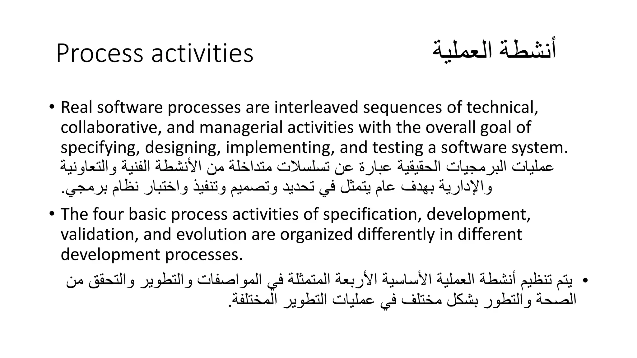 تتضمن العملية أنشطة برمجية متداخلة تشمل الأبعاد الفنية والإدارية والتعاونية بهدف تحديد وتصميم وتنفيذ واختبار نظام برمجي. تشمل الأنشطة الأساسية أربعة جوانب: المواصفات والتطوير والتحقق والتطور، ويتطلب تحسين المواصفات فهمًا شاملًا ومتطلبات محددة. يتضمن تطوير البرمجيات استراتيجيات متعددة كالتصميم المعماري وتطوير قواعد البيانات وواجهات المستخدم، ويشمل أيضًا مراحل متعددة من التحقق تشمل اختبار المكونات والنظام والعميل.