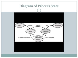 This document discusses CPU scheduling and processes. It defines key concepts like process state, process control block (PCB), and context switching. It explains that the CPU scheduler is responsible for selecting the next running process based on scheduling strategies. Common scheduling strategies discussed include first-come first-served (FIFO), round robin, shortest job first (SJF), priority scheduling, and multilevel feedback queues. It also covers performance metrics for evaluating scheduling algorithms and using deterministic modeling to analyze how processes execute under different scheduling policies.
