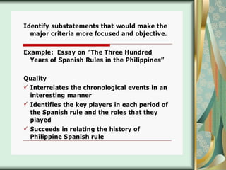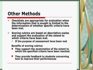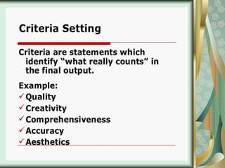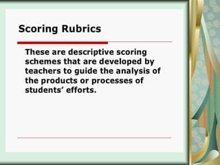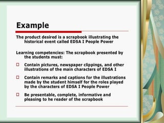 This document discusses process-oriented and product-oriented performance-based assessment. Process-oriented assessment evaluates the actual task performance and does not emphasize the output. It aims to understand the processes a person uses to complete a task. Product-oriented assessment focuses on the final product and output, and evaluates it based on levels of performance like novice, skilled, and expert. Both types of assessment require carefully designing learning tasks and creating rubrics with criteria, levels of performance, and descriptors to consistently score students.