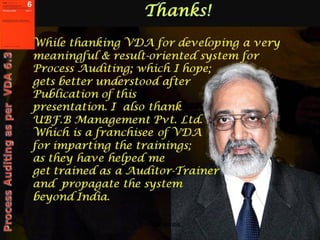 The document discusses VDA 6.3, a standard for quality management system audits. It describes the standard's focus on assessing process performance rather than just conformance. The VDA 6.3 audit analyzes processes to detect risks and weaknesses. It evaluates four key elements: process responsibility, target orientation, communication, and risk identification. The audit also assesses processes across the product lifecycle from project planning to after-sales service. Organizations are rated on a color-coded scale after the audit to indicate capabilities and needs for improvement.