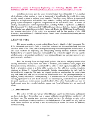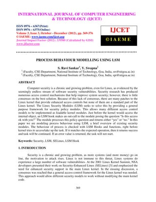 The document discusses process behavior modelling using Linux Security Modules (LSM). It describes how LSM provides a framework for security modules by inserting hooks at critical points in the kernel. A behavior monitoring module is implemented that checks system calls of a process against an expected profile held by a daemon. If a call does not match, the process is terminated, otherwise it is allowed to continue. Experiments show the module can successfully intercept calls and monitor process behavior with minimal overhead.