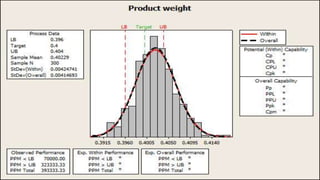 This document discusses process capability analysis. It defines tolerance as the maximum acceptable error for a component. For example, a shaft diameter between 49.5-50.5mm is acceptable. Errors can be common causes, reduced through improved machinery, or special causes that cannot be predicted. Data was collected from a food and drug company showing process testing and statistics. The Cp and Cpk indices measure process potential and centering, with values over 1 indicating a reliable process. Cpk is the minimum value to show where defects are prominent, such as towards the upper or lower specification limits. A centered process has Cp equal to Cpk.