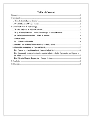 This document provides an overview of process control applications in chemical industries. It discusses what process control is, why it is needed, common control techniques like feedback control, and examples of control systems for units like chemical reactors and boilers. Process control is used to maximize safety, quality and efficiency in chemical processes. It allows preserving product quality while optimizing production. The document also reviews various software and instruments used for process control and highlights its importance across many industrial sectors.