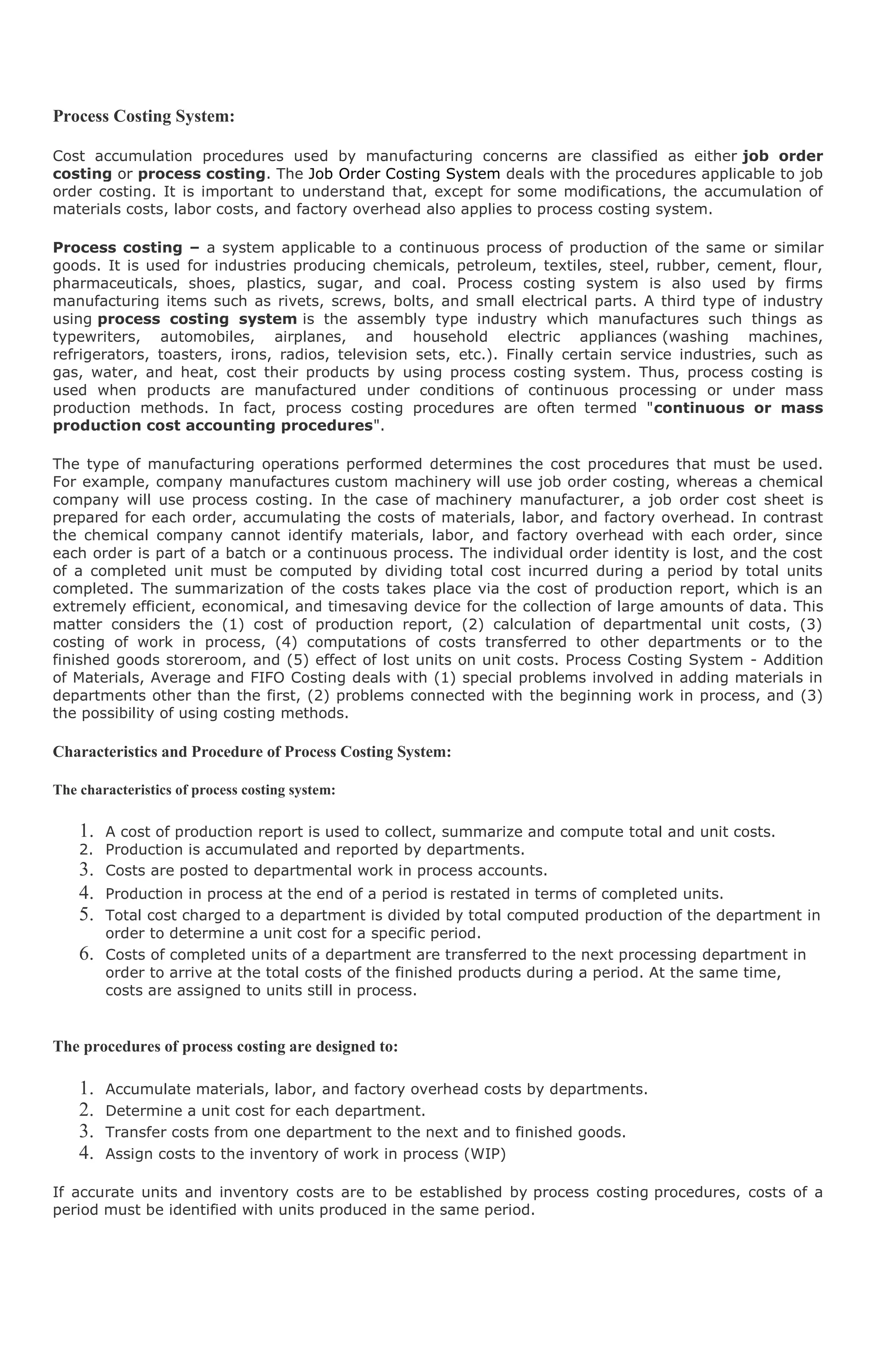 The document discusses process costing systems used in manufacturing. Process costing is used for continuous production of similar goods and involves accumulating costs by department. Key points include: