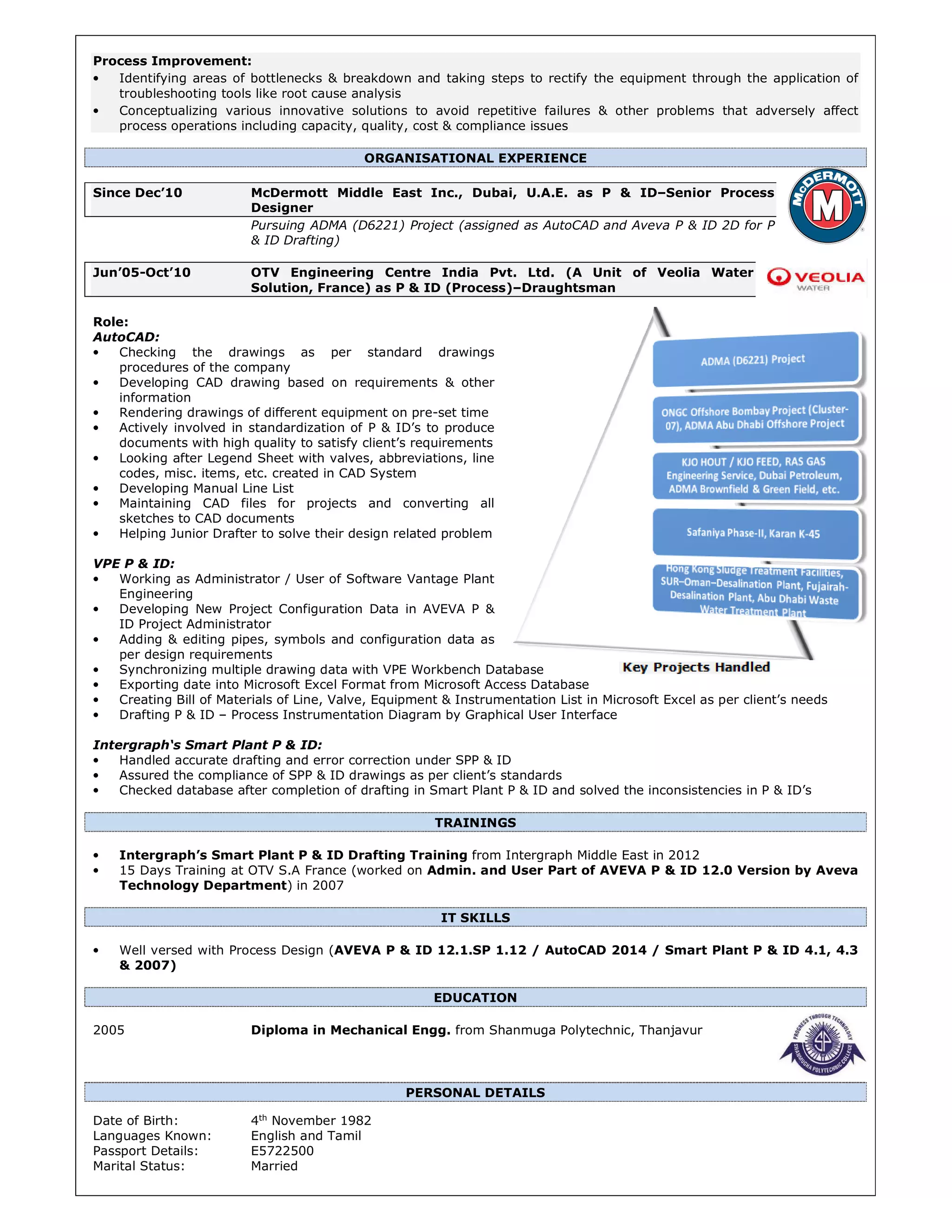 K. Ashok is a senior process designer with over 10 years of experience in project management, AutoCAD operations, and P&ID operations in the oil and gas industry. He has expertise in ramping up projects on time while maintaining high quality standards. Currently located in Dubai, UAE, his previous employers include McDermott Middle East Inc. and OTV Engineering Centre India Pvt. Ltd. He is proficient in AutoCAD, Aveva VPE P&ID, and Intergraph's Smart Plant P&ID software.