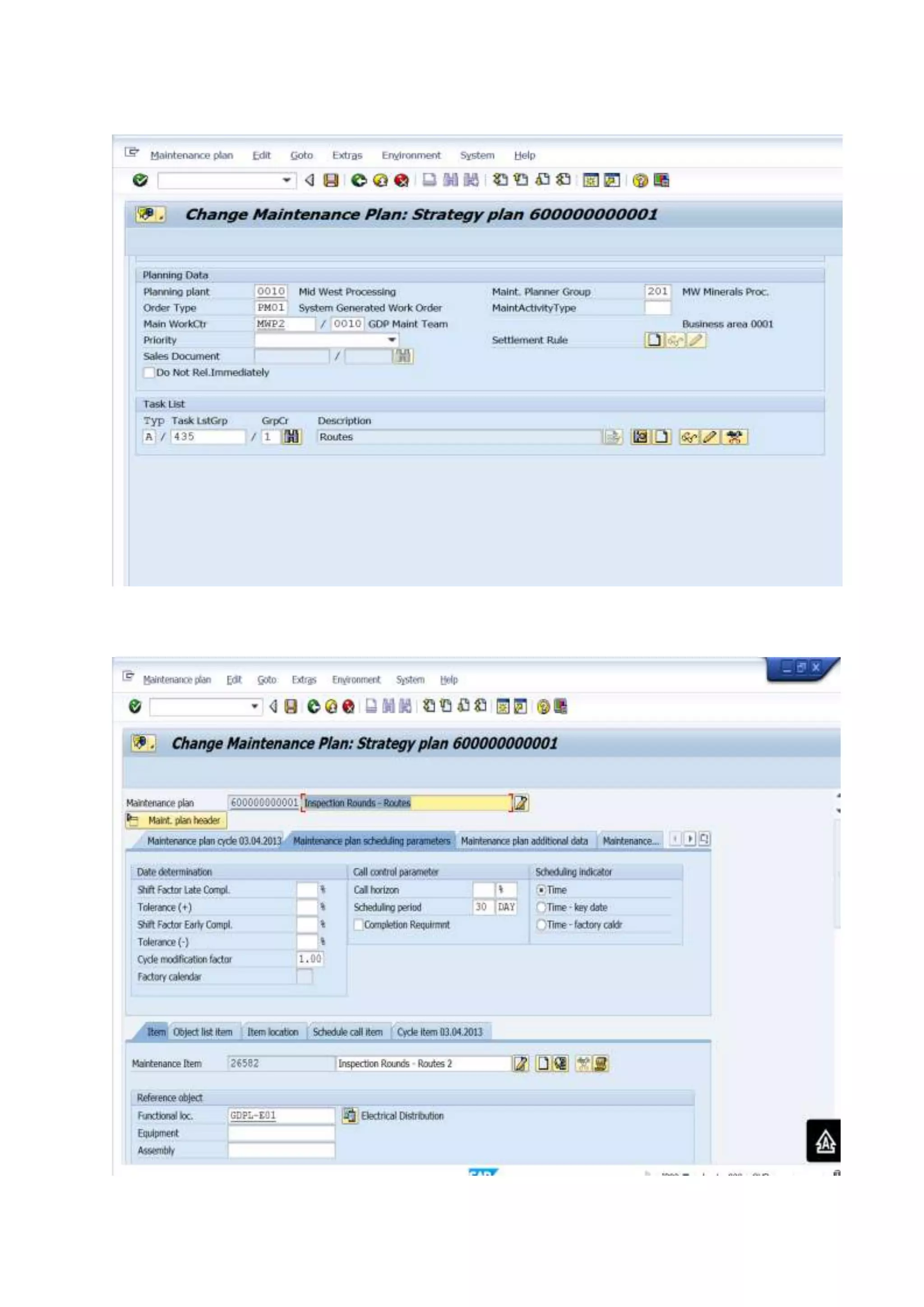 This document describes how to use inspection rounds and operation account assignment functionality in SAP PM. It provides instructions for defining an inspection round using a general task list, planning the inspection round by creating a maintenance plan and assigning the task list, and executing the inspection round by further planning any generated maintenance orders and recording time and costs at the operation level linked to different equipment references. Background prerequisites and configurations are also outlined.