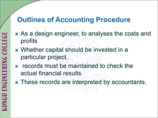 The document provides details on accounting procedures and concepts. It discusses: